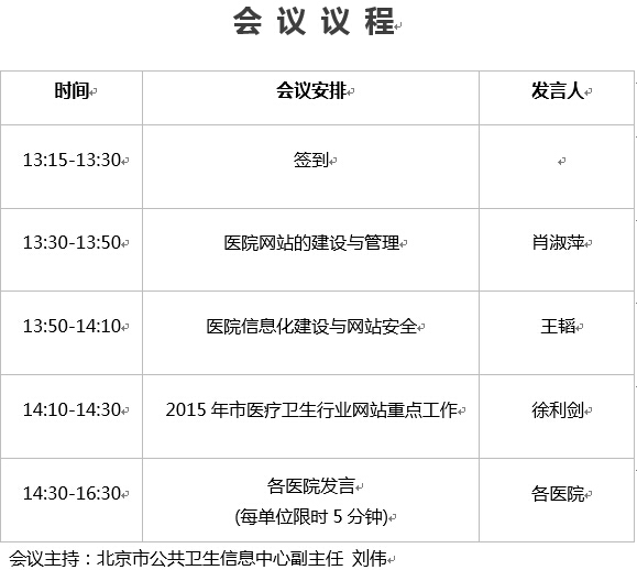 为了促进北京地区网站管理工作顺利开展,加强网站管理工作者的交流,北京市公共卫生信息中心将召开2015年季度北京地区网站管理工作座谈会,主要交流和讨论在互联网医疗大背景下2015年各家单位网站工作的计划和思路。
