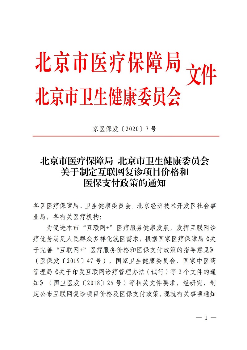 北京市医疗保障局 北京市卫生健康委员会关于制定互联网复诊项目价格和医保支付政策的通知